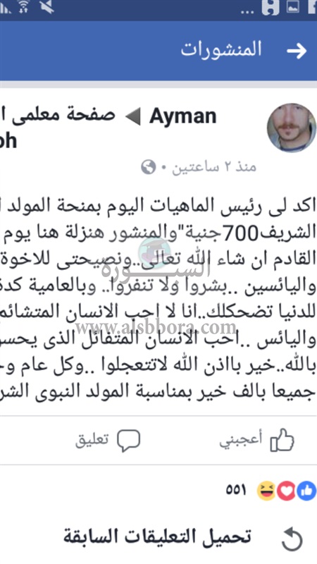 واضاف احدى النشطاء، المنشور هنزلة هنا يوم الثلاثاء القادم ان شاء الله تعالى..ونصيحتى للاخوة المتشائمين واليائسين ..بشروا ولا تنفروا.. وبالعامية كدة..اضحك للدنيا تضحكلك..انا لا احب الانسان المتشائم والمشكك واليائس ..احب الانسان المتفائل الذى يحسن الظن بالله..خير بااذن الله لاتتعجلوا ..وكل عام وحضراتكم جميعا بالف خير بمناسبة المولد النبوى الشريف ..وشكرا.