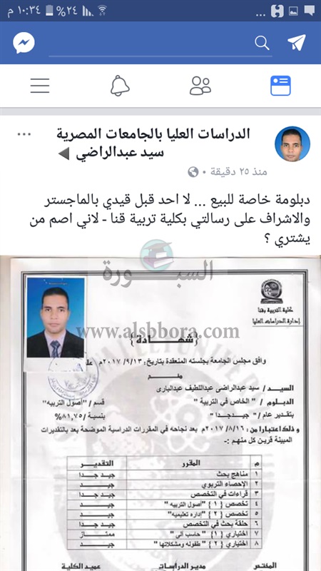 وكتب الطالب بجروب الدراسات العليا بالجامعات المصرية، "دبلومة خاصة للبيع" لااحد قبل قيدى بالماجستير والاشراف على رسالتى بكلية التربية قنا، لانى اصم من يشترى.