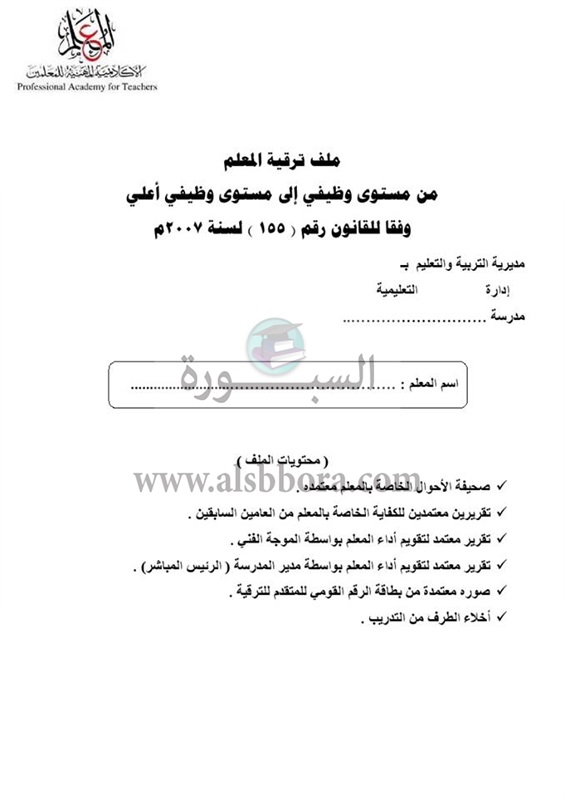 ينشر موقع السبورة ملف ترقية المعلمين للعام 2018/2017، طبقا لقانون رقم 155 لسنة 2007 وتعديلاته.