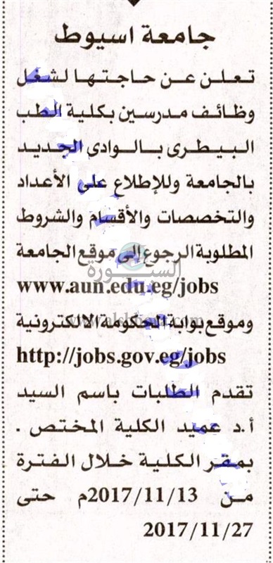 تعلن جامعة أسيوط عن حاجتها الى أعضاء هيئة التدريس، وللاطلاع على الاعداد والتخصصات والأقسام والشروط المطلوبة الرجوع الى موقع الجامعة المنشور فى اعلان جريدة الأهرام فى عدد اليوم الجمعة الموافق 10 نوفمبر 2017.