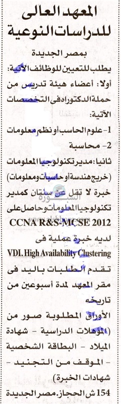 يعلن المعهد العالى للدراسات النوعية عن حاجته الى أعضاء هيئة التدريس، وعلى الراغبين فى الحصول على الوظيفة التقدم بطلبات باليد الى مقر المعهد لمدة أسبوعين من تاريخ نشر الاعلان بجريدة الأهرام فى عدد اليوم الجمعة الموافق 10 نوفمبر 2017.