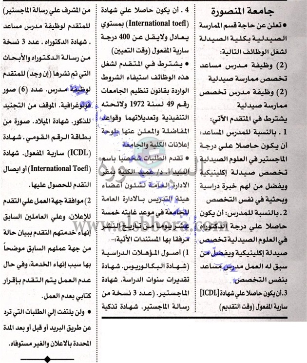 تعلن جامعة المنصورة عن وظائف جديدة لأعضاء هيئة التدريس "من حملة الماجستير والدكتوراه" علما بأن أخر موعد للتقديم الأربعاء المقبل وذلك وفقا لنص الاعلان التالي:-