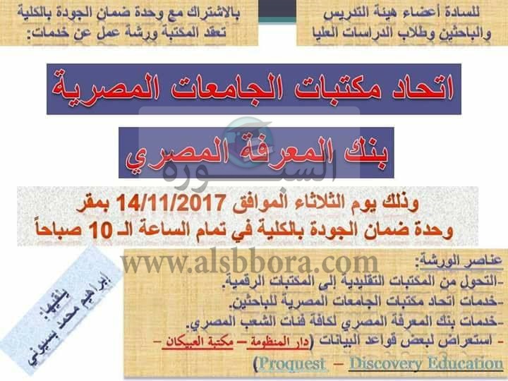 تعقد كلية الاداب جامعه طنطا ورشة عمل عن خدمات اتحاد مكتبات الجامعات المصرية وبنك المعرفة المصري ، بالتعاون مع وحدة ضمان الجوده بالكلية وذلك يوم الثلاثاء الموافق14/11/2017 بمقر وحده ضمان الجوده بالكلية في تمام الساعة ال10 صباحا .