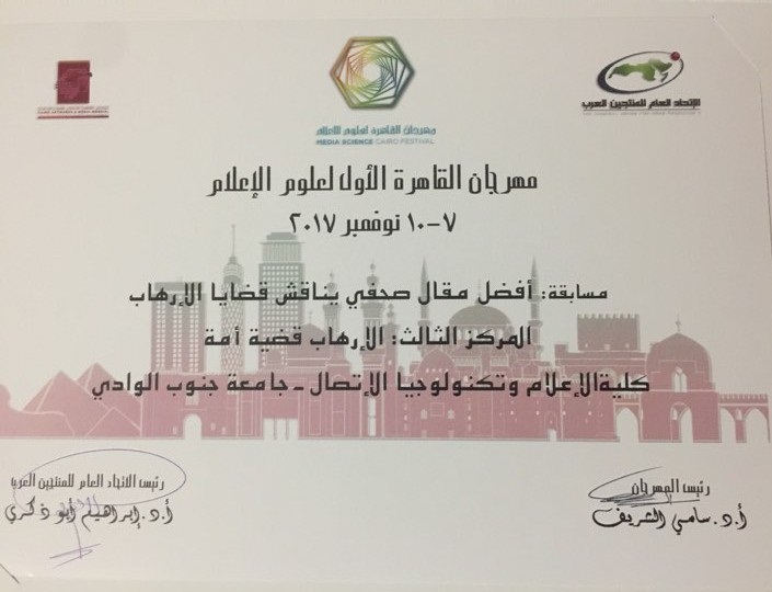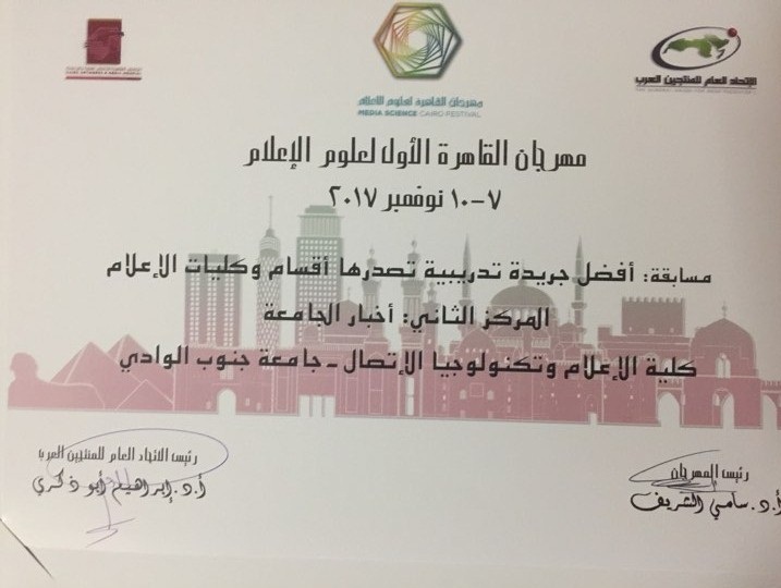 حصدت كلية الاعلام وتكنولوجيا الاتصال بجامعة جنوب الوادى جائزتين للصحافة فى الحفل الختامى الذى اقيم بجامعة القاهرة فى ختام فعاليات مونديال القاهرة للاعمال الفنية والاعلام فى دورته السادسة، والتى شارك فيها اكثر من ٣٤ كلية وقسم للاعلام فى الجامعات المصرية والخاصة تقدموا باكثر من ٣٦٠ مشروع اعلامى من مشروعات الطلبة تنافست فيها كل الجامعات ليفوز بالمسابقات ٣٣ مشروع فقط كان لاعلام جنوب الوادى نصيب منها فى الفوز بجائزتين هما المركز الثانى لجائزة افضل جريدة تدريبية تصدرها اقسام وكليات الاعلام وهى جريدة: "اخبار الجامعة" والمركز الثالث لجائزة افضل مقال صحفى عن "الارهاب قضية امة" .