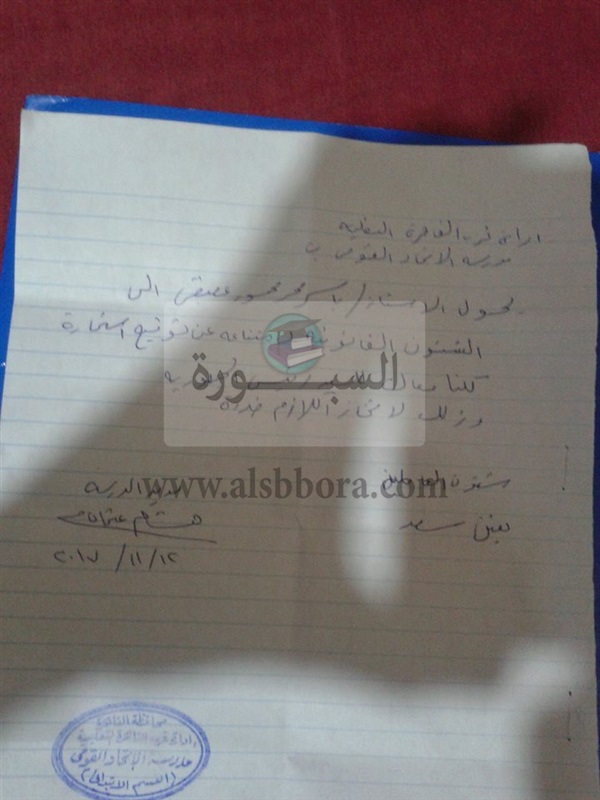 وقد تضمنت الورقة توقيع المسؤولة عن شؤون العاملين بالمدرسة نيفين سعد.