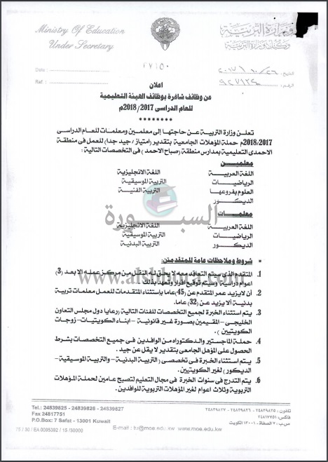 تعلن وزارة التعليم الكويتية عن وظائف جديدة للمعلمين والمعلمات وذلك وفقا لنص الإعلان التالي:-