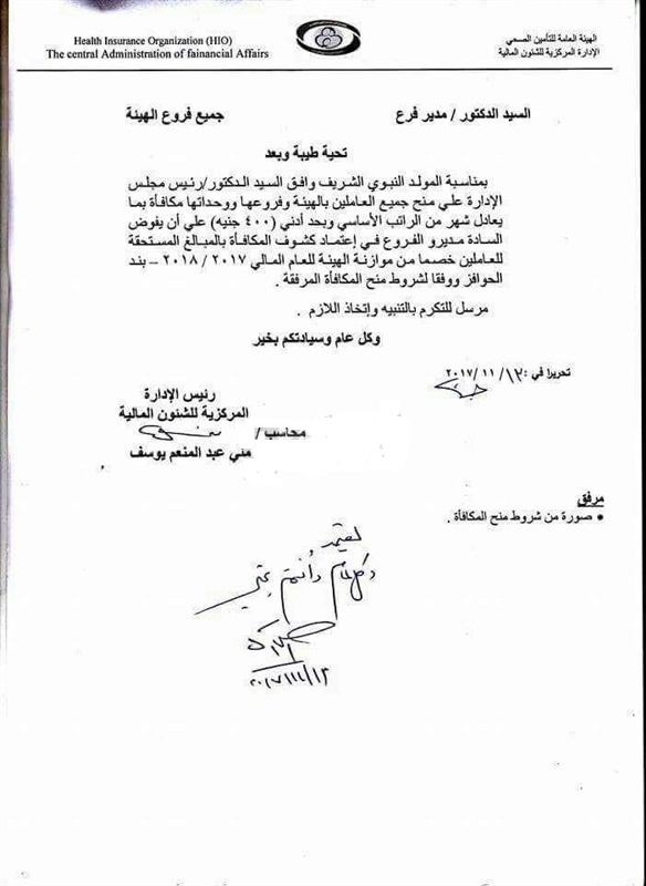 قرر الدكتور علي حجازي رئيس هيئة التأمين الصحي صرف مكافأة تعادل شهر من الراتب الأساسي للعاملين بالهيئة وفروعها في المحافظات بمناسبة المولد النبوي الشريف بحد أدنى 400 جنيه.