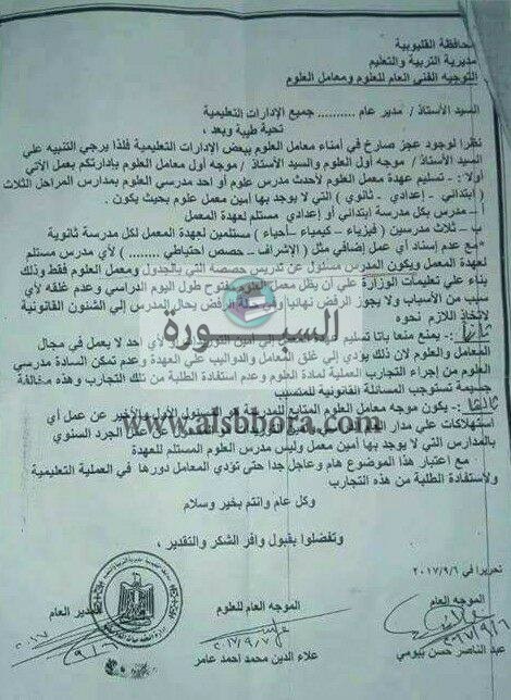 أصدرت مديرية التربية والتعليم بمحافظة القليوبية قرارا بشأن معلمى العلوم وعهدة المعمل مع عدم اسناد أى عمل اضافى مثل الاشراف وحصص الاحتياطى.