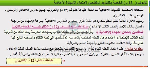تهيب الادارة العامة لنظم المعلومات ودعم اتخاذ القرار بمديرى المدارس الاعدادية بسرعة الانتهاء من مراجعة وتدقيق بيانات تلاميذ الصف الثالث الاعدادى وذلك لطباعة كشوف (12د) الالكترونية الخاصة بتلاميذ المعتمدين لامتحان الشهادة الاعدادية.