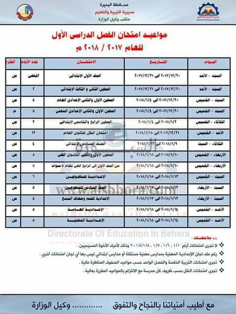 أعلنت مديرية التربية والتعليم بمحافظة البحيرة عن مواعيد بدء امتحانات الفصل الدراسي الأول. 2017 / 2018 على ان تبدأ 30 ديسمبر المقبل حتى 12 يناير 2018.