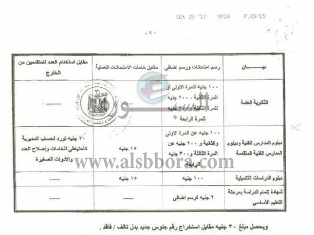 ننشر نشرة مصاريف رسوم امتحانات الثانوية العامة للعام الدراسى 2018/2017