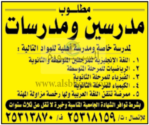 تعلن عدد من كبري المدارس في دولة الكويت عن وظائف جديدة للمعلمين والمعلمات وذلك وفقا لنص الإعلان التالي: