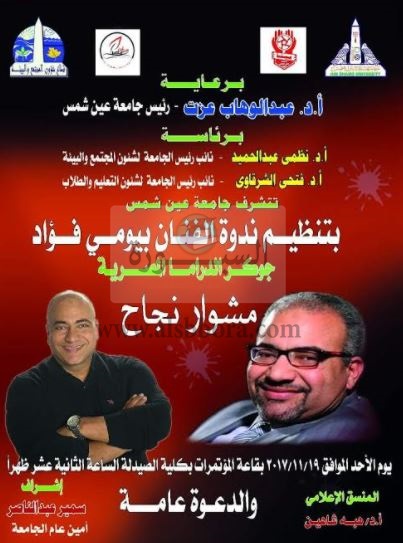 تحت رعاية عبد الوهاب عزت رئيس جامعة عين شمس و برئاسة نظمي عبد الحميد نائب رئيس الجامعة لشئون خدمة المجتمع وتنمية البيئة وفتحي الشرقاوي نائب رئيس الجامعة لشئون التعليم والطلاب ينظم قطاع شئون خدمة المجتمع وتنمية البيئة بالتعاون مع أسرتي " بينا" و "من أجل مصر" المركزيتين ندوة فنية بعنوان " جوكر الدراما المصرية: مشوار نجاح" و التي تستضيف الفنان بيومي فؤاد وذلك غدا الأحد الموافق 19 من نوفمبر الجاري في تمام الساعة الثانية عشر ظهرا بقاعة المؤتمرات الكبرى بجوار كلية الصيدلة.