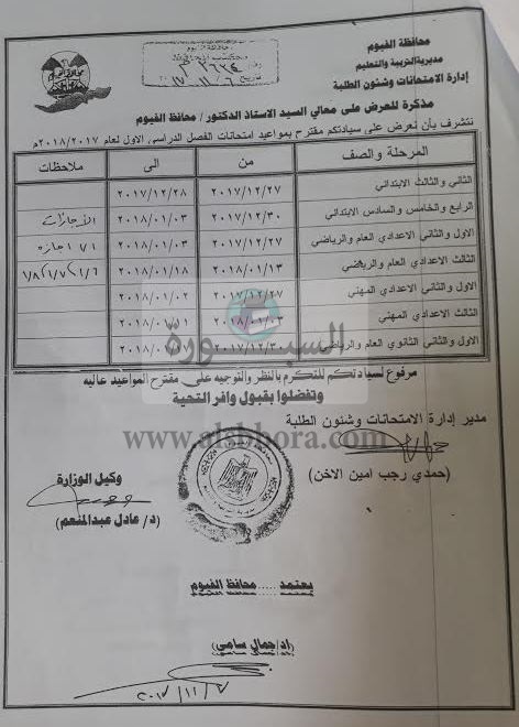 حيث اعتمد الدكتور جمال سامى محافظ الفيوم، والدكتور عادل عبد المنعم وكيل وزارة التربية والتعليم بالفيوم، جدول سير الامتحان للفصل الدراسى الأول عام 2017 / 2018 حيث تجرى امتحانات الصف الثانى والثالث الابتدائى يومى 27 و28 ديسمبر المقبل.