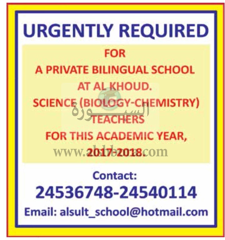 تعلن عدد من كبري المدارس العمانية بسلطنة عمان عن وظائف جديدة للمعلمين والمعلمات وذلك وفقا لنص الإعلان التالي:-