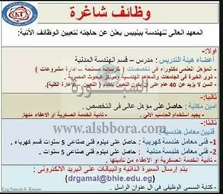 اعلن المعهد العالى للهندسة عن عدد من الوظائف الشاغرة ووفقا للاعلان التالى:-