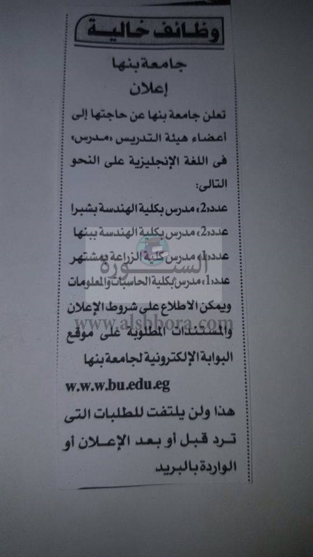 كشفت مصادر مطلعة بجامعة بنها بأنه وعقب نشر إدارة الجامعة لإعلان عن وظائف جديدة فإن عدد المتقدمين حتي الان لم يزيد عن 2 فقط.