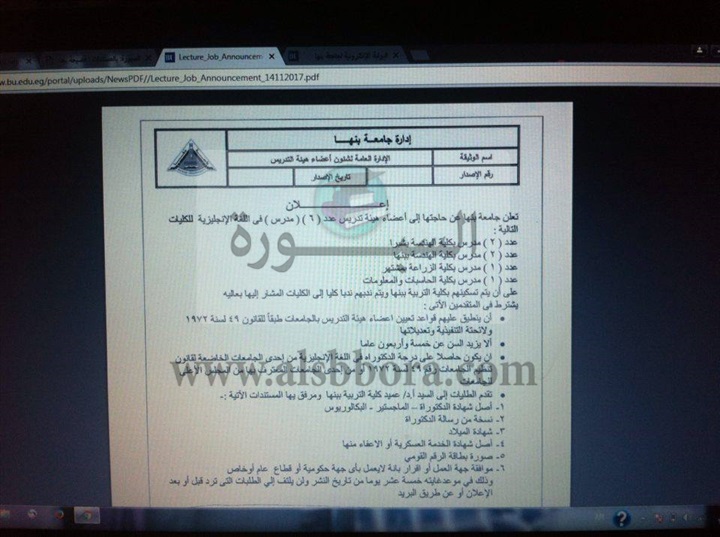 قبل انتهاء موعد التقديم بأسبوع| جامعة بنها تعلن عن أماكن شاغرة لأعضاء هيئة التدريس .. ننشر نص الإعلان والأوراق المطلوبة