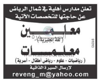 تعلن مدرسة خاصة في السعودية عن وظائف جديدة للمعلمين والمعلمات وذلك وفقا لنص الإعلان التالي:-