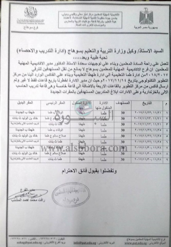 وافقت الاكاديمية المهنية للمعلمين على نقل تدريبات معلمي إدارة طهطا من قاعات إدارة طما إلى قاعات بإدارة طهطا وفق المواعيد المحددة باخطار كل معلم.