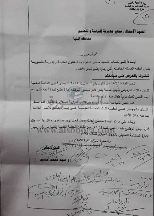 أرسلت ادارة الاستحقاقات بوزارة التربية والتعليم كتابا الى مديرية التربية والتعليم بمحافظة المنيا بأحيقة المعلمات الحاصلات على إجازة وضع فى الحصول على أجر كامل بما فيها حافز الإثابة.