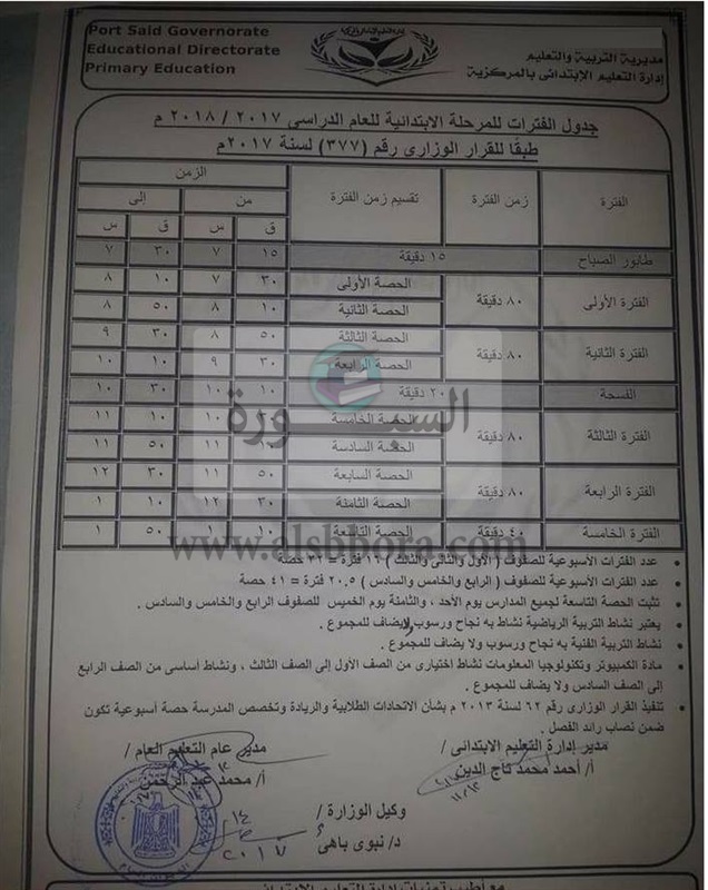 حيث اصدرت مديرية التربية والتعليم بمحافظة بورسعيد تعليماتها طبقا للقرار الوزارى 377 لسنة 2017 بتخفيض زمن حصص جميع المدارس بالادارات التعليمية بمنشور رسمى ، تم اصدارة لجميع الادارات على ان يكون الطابور للصباح الساعه 7 : 15 الى 7 : 30 لمدة 15 دقيقة ، ومده كل فترة دراسية 80 دقيقة بموجب 40 دقيقة لكل حصة دراسية على ان تنهى الفترة الخامسة الساعه 1 و 50 دقيقة يوميا .