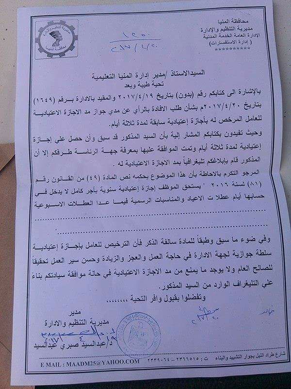 ننشر..كتاب مديرية التنظيم والادارة بالمنيا الموجة إلي مدير إدارة المنيا التعليمية بشأن جواز مد الاجازة الاعتيادية عن طريق التلغراف بانه لا يوجد ما يمنع من مد الاجازة الاعتيادية في حالة موافقة الجهة الادارية وفي ضوء حاجة العمل والعجز والزيادة وحسن سير العمل تحقيقا للصالح العام