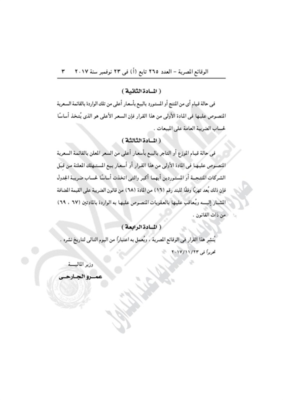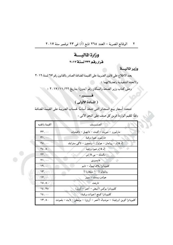 نشرت الجريدة الوقائع الرسمية، اليوم الخميس، قرار زيادة أسعار بيع السجائر التي تتخذ لحساب الضريبة على القيمة المضافة، وفقا للقيم الواردة على كل صنف.