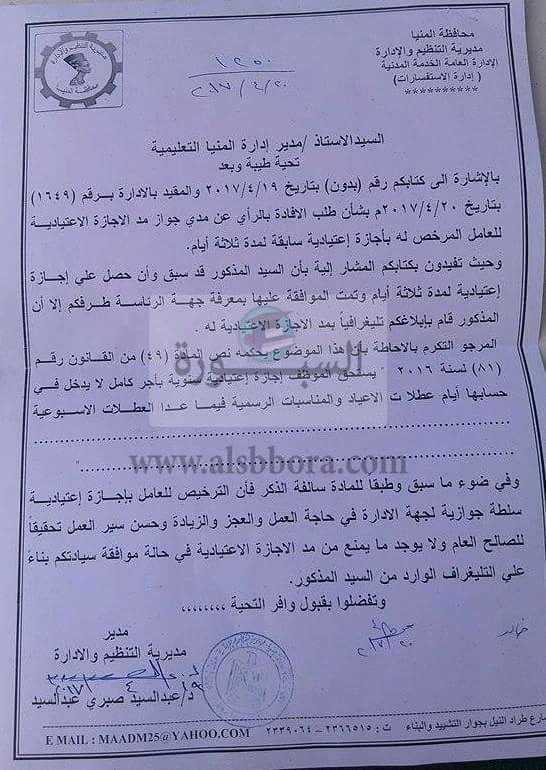 ارسل الجهاز المركزى للتنظيم والادارة فاكسا هاما الى مديرية التربية والتعليم بمحافظة المنيا بشأن الاجازات الاعتيادية للمعلمين.
