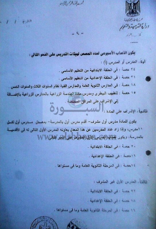وأضاف أن المعلم الوحيد الذي يخفض له النصاب المعلم المشرف على مادة التخصص ويخفض له النصاب بمقدار حصتين طبقا لنص المادة رقم 22 من اللائحة التنفيذية للقانون رقم 93 لسنة 2012م الصادرة بقرار رئيس مجلس الوزارء رقم 428 لسنة 2013م.