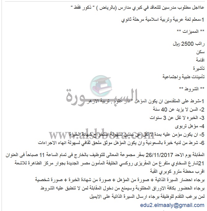 تعلن مدرسة خاصة في المملكة العربية السعودية عن وظائف جديدة للمعلمين والمعلمات وذلك وفقا لنص الإعلان التالي:-