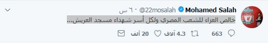 صلاح: خالص العزاء للشعب المصري ولكل أسر شهداء مسجد العريش