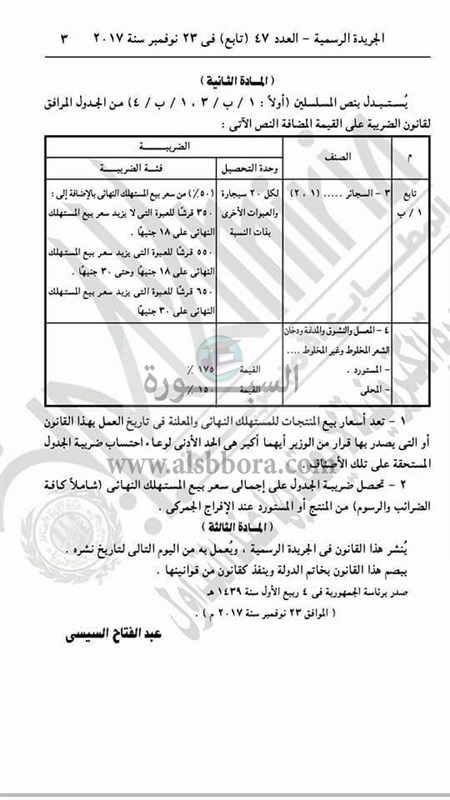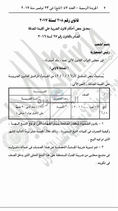 عاجل.. الرئيس السيسى يصدر قانون رقم 208 لسنة 2017 بتعديل بعض احكام قانون الضريبة المضافة