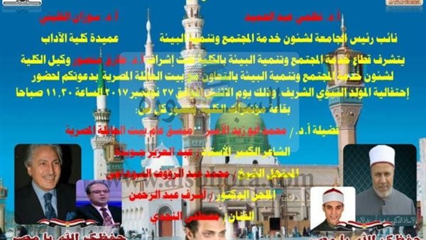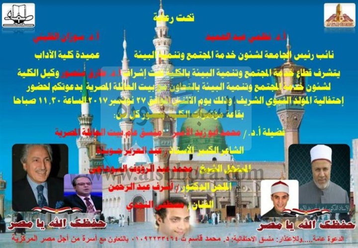 ينظم قطاع خدمة المجتمع و تنمية البيئة بكلية الاداب بجامعة عين شمس لأول مرة إحتفالية دينية في حب رسول الله ، تحت رعاية عبد الوهاب عزت رئيس الجامعة ، نظمى عبدالحميد نائب رئيس الجامعة لشئون خدمة المجتمع و تنمية البيئة ،سوزان القليني عميد الكلية ، و إشراف طارق منصور وكيل الكلية لشئون القطاع ، وذلك فى تمام الحادية عشر و النصف من صباح يوم الإثنين الموافق 27 من نوفمبر الجاري بقاعة مؤتمرات الكلية .