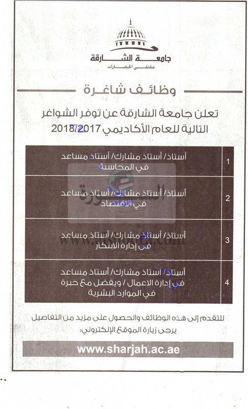 تعلن جامعة الشارقة عن وظائف جديدة لأعضاء هيئة التدريس "من حملة الماجستير والدكتوراه" وذلك وفقا لنص الإعلان التالي:-