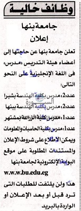 تعلن جامعة بنها عن وظائف جديدة لأعضاء هيئة التدريس "من حملة الماجستير والدكتوراه" علما بأن أخر موعد للتقديم غدا الاثنين وذلك وفقا لنص الإعلان التالي:-