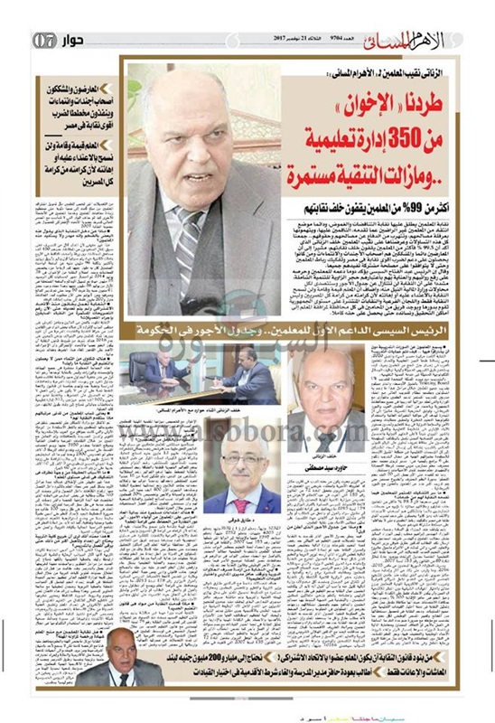 تداول عدد من نشطاء المعلمين نص الحوار الذي نشرته جريدة الأهرام المسائي لنقيب المعلمي خلف الزناتي والذي أكد فية أن الرئيس السيسي الداعم الأول للمعلمين وجدول مرتبات المعلمين في الحكومة وعودة حافز مدير المدرسة وإلغاء الأقدمية.