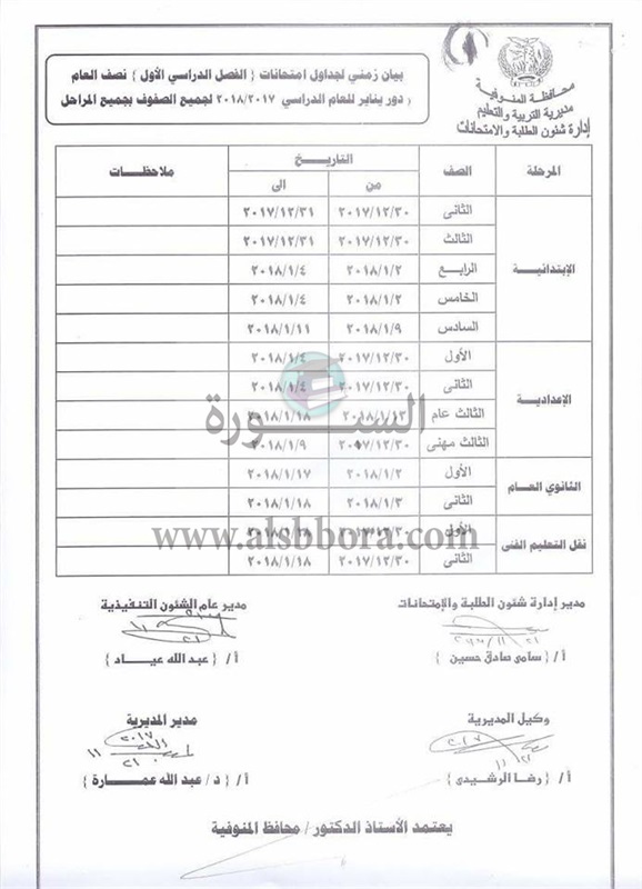 أوضح الدكتور عبد الله عمارة وكيل وزارة التربية والتعليم بالمنوفية أنه تم وضع جدول زمني لاختبارات الفصل الدراسي الاول بالمنوفية للعام الدراسى 2017 |2018 يبدأ من 30|12|2017 وينتهى فى 18|1|2018 .