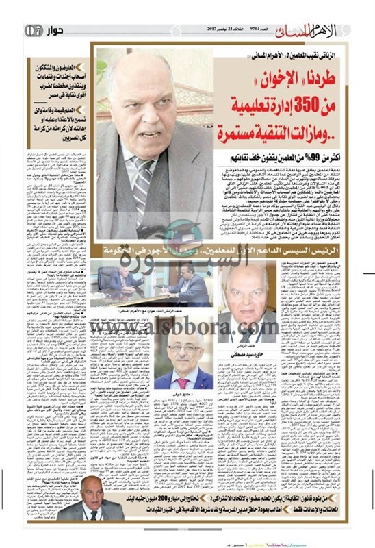 تداول عدد من نشطاء المعلمين نص الحوار الذي نشرته جريدة الأهرام المسائي لنقيب المعلمي خلف الزناتي والذي أكد فية أن الرئيس السيسي الداعم الأول للمعلمين وجدول مرتبات المعلمين في الحكومة وعودة حافز مدير المدرسة وإلغاء الأقدمية.