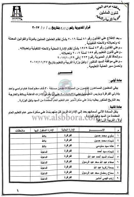 أصدرت مديرية التربية والتعليم بمحافظة الوادى الجديد نشرة بتنقلات المعلمين والمعلمات الجدد من والى الادارات التعليمية، والتى كانت قد صدرت بشأن تنظيم انتقال المعلمين المعينين على مسابقة 30 ألف معلم، والتى تم تنظيمها على مستوى الجمهورية.
