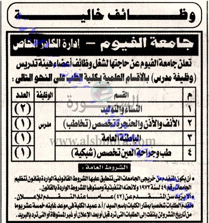 أعلنت جامعة الفيوم عن حاجتها الى أعضاء هيئة التدريس، وعلى الراغبين فى الحصول على الوظيفة تقديم الطلبات شخصيا الى عميد الكلية فى موعد غايته 15 يوما من تاريخ نشر الاعلان والذى تم نشره فى جريدة الجمهورية اليوم الأربعاء الموافق 29 نوفمبر 2017.