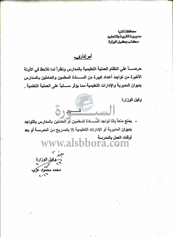 اصدرت مديرية التربية والتعليم بالمنيا امر اداري ينص على "يمنع منعا باتا تواجد المعلمين اوالعاملين بالمدارس بالتواجد بديوان المديرية او الادارات التعليمية الابتصريح من المدرسة او بعد اوقات العمل بالمدرسة.