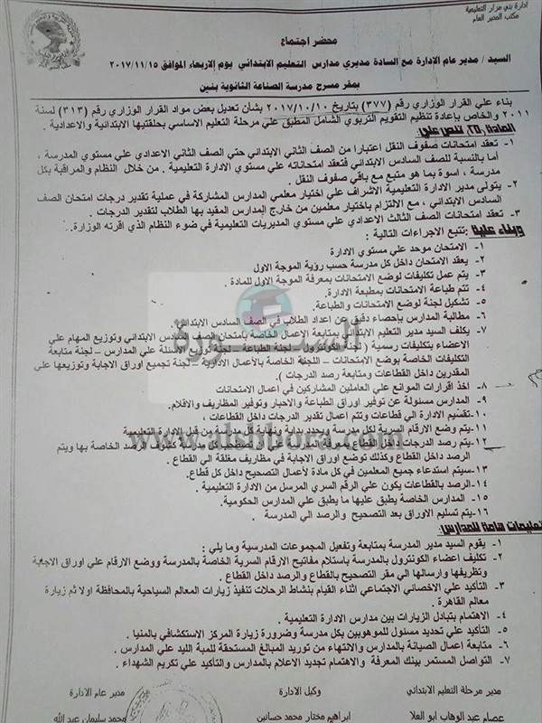 بناءا على القرار الوزارى رقم 377 بتاريخ2017/10/10 بشأن تعديل بعض مواد القرار الوزارى رقم 313 والخاص بإعادة تنظيم التقويم التربوى الشامل المطبق على مرحلة التعليم الأساسى بحلقتيها الابتدائية والاعدادية صدرت نشرة لجميع الإدارات تحمل التعليمات التالية:
