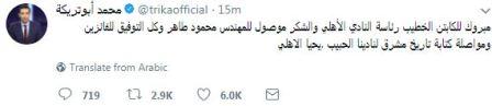 ونشر تريكة تغريدة على تويتر قال فيها: "مبروك الكابتن محمود الخطيب رئاسة النادى الاهلى والشكر موصول للمهندس محمود طاهر وكل التوفيق للفائزين ومواصلة كتابة تاريخ مشرق لنادينا الحبيب.. يحيا الاهلى"