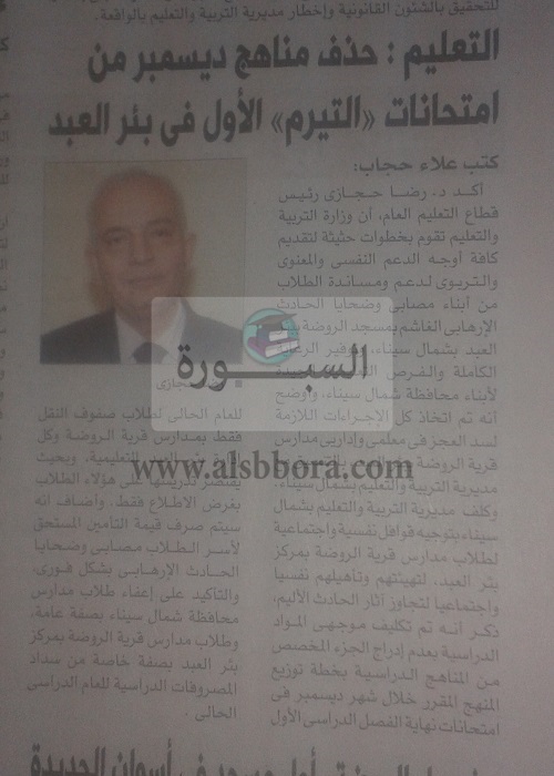 وأوضح أنه تم اتخاذ كل الاجراءات اللازمة لسد العجز فى معلمى واداريى مدارس قرية الروضة ببئر العبد بالتنسيق مع مديرية التربية والتعليم بشمال سيناء بتوجيه قوافل نفسية واجتماعية لطلاب مدارس قرية الروضة.