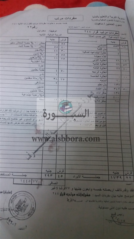 تنشر "السبورة" قرار وزارة التربية والتعليم الخاص بخصم 50 جنيها من مرتبات المعلمين اعتبارا من شهر الحالي ومفردات المرتب بعد الخصم .