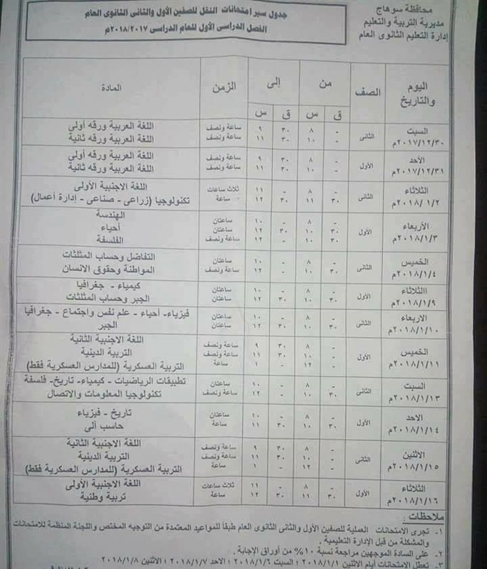 ينشر لكم موقع السبورة جدول امتحانات نصف العام للصف الاول والثانى الثانوى لمحافظة سوهاج 2018/2017.