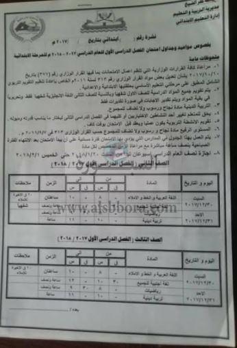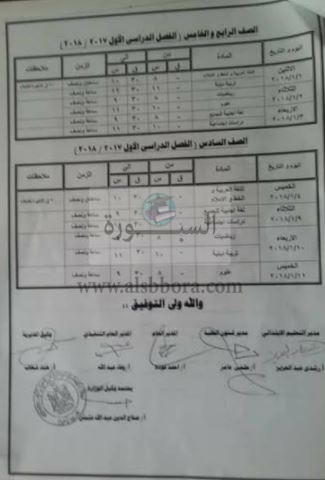 أكد رشدى عبد العزيز مدير إدارة التعليم الإبتدائى بمديرية التربية والتعليم بكفرالشيخ، أن صلاح عثمان وكيل وزارة التربية والتعليم، إعتمد جداول إمتحانات النصف الدراسي الأول للعام 2017 / 2018م للمرحلة الإبتدائية، في حضور هناء شهاب وكيل المديرية ومدراء العموم بالمديرية .
