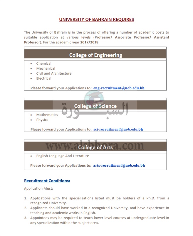 تعلن جامعة البحرين عن وظائف جديدة لأعضاء هيئة التدريس "من حملة الماجستير والدكتوراه" وذلك وفقا لنص الإعلان التالي:-