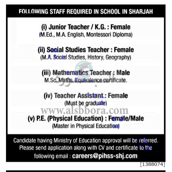 تعلن مدرسة خاصة في دولة الإمارات عن وظائف جديدة للمعلمين والمعلمات وذلك وفقا لنص الإعلان التالي:-